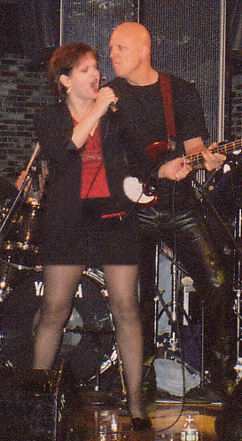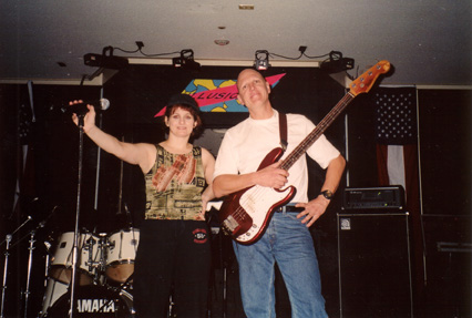 | Roger Capps dancing with Pam to see if she's the "same height as Pat!" Roger was the original bass player for the Pat Benatar Band (see "Pat Benatar - In Concert Then" picture below...Roger's in the background). He recorded the first five albums and co-penned "Hell Is For Children," one of Pat's biggest hits! Roger sat in with HeartBreaker for 3 songs, July 25, 2003 at B.B. Kings on the Universal City Walk! What a treat and an honor to be acknowledged by an original band member! Thank you Roger! We hope to do it again soon! (The happy guy in the background is Phil, one of Pat's guitar students, thumbs up!) |